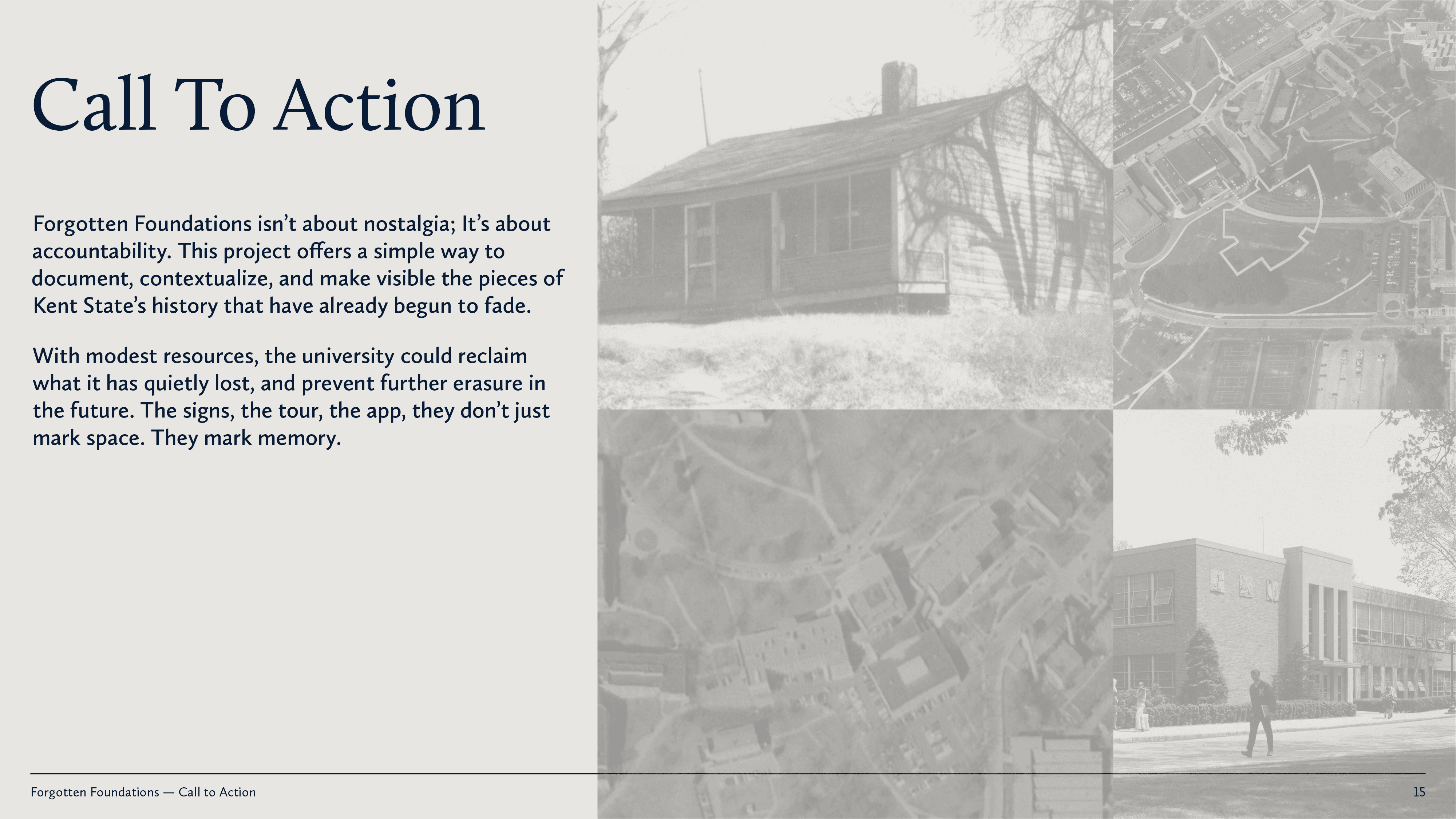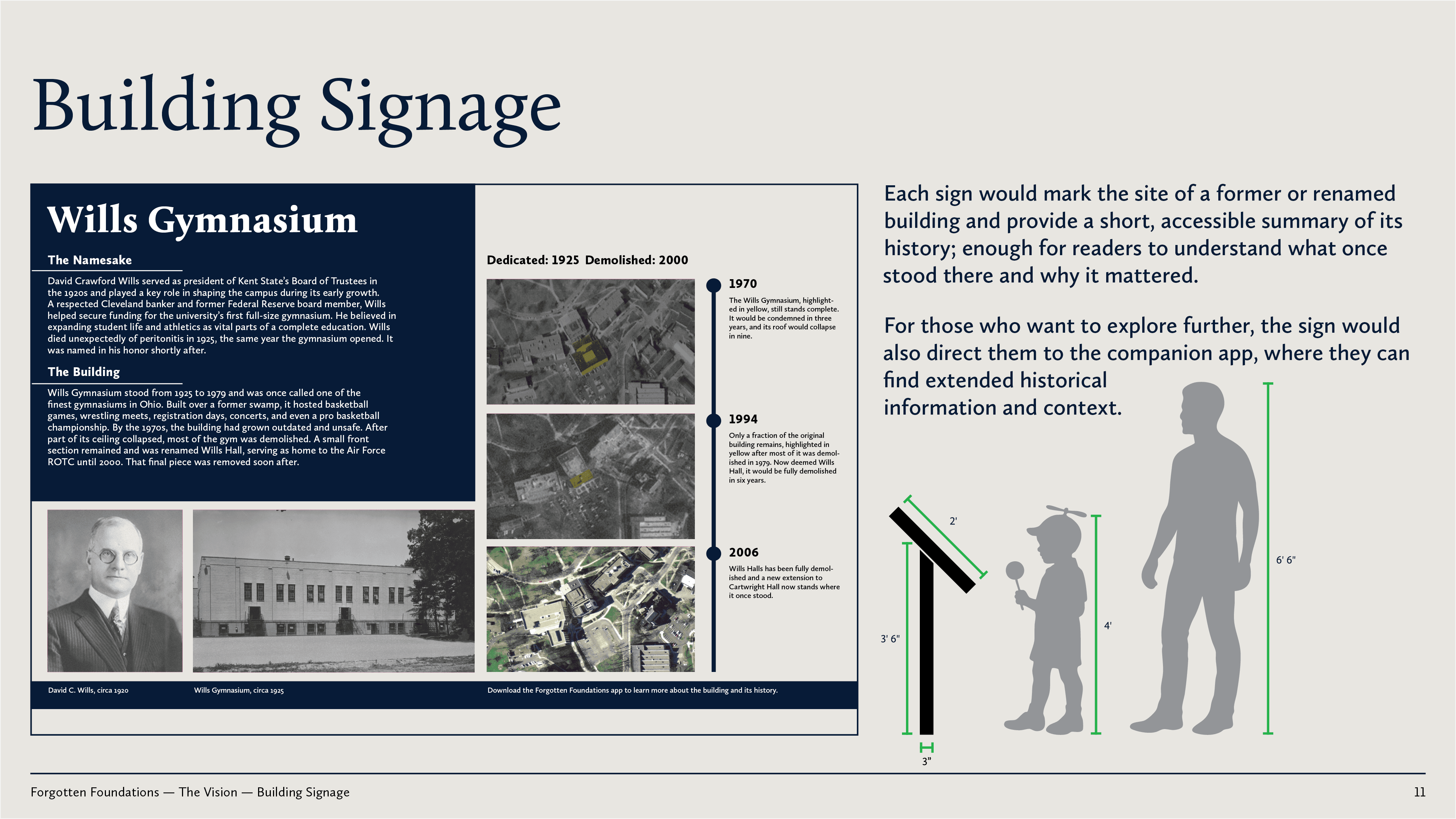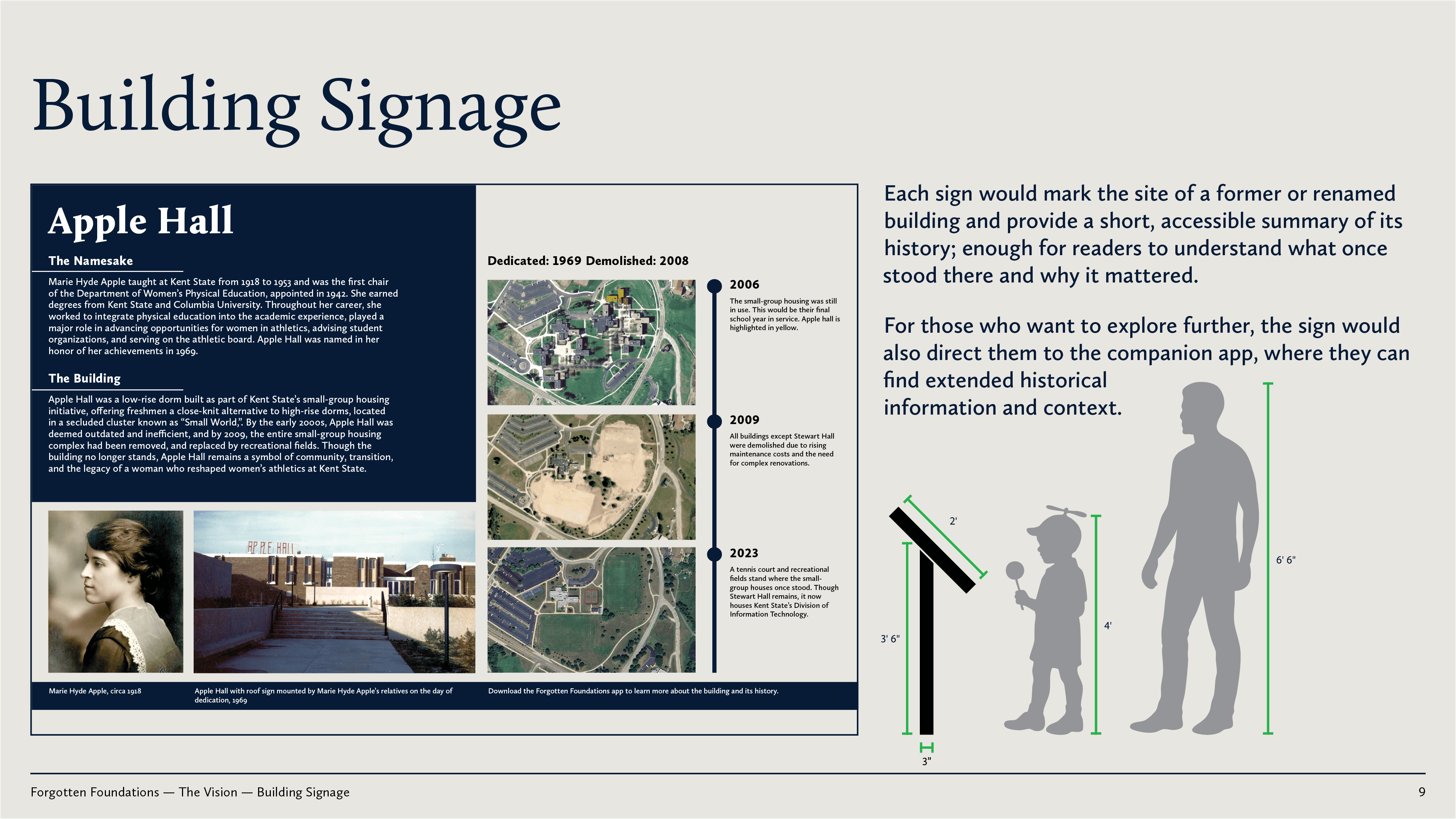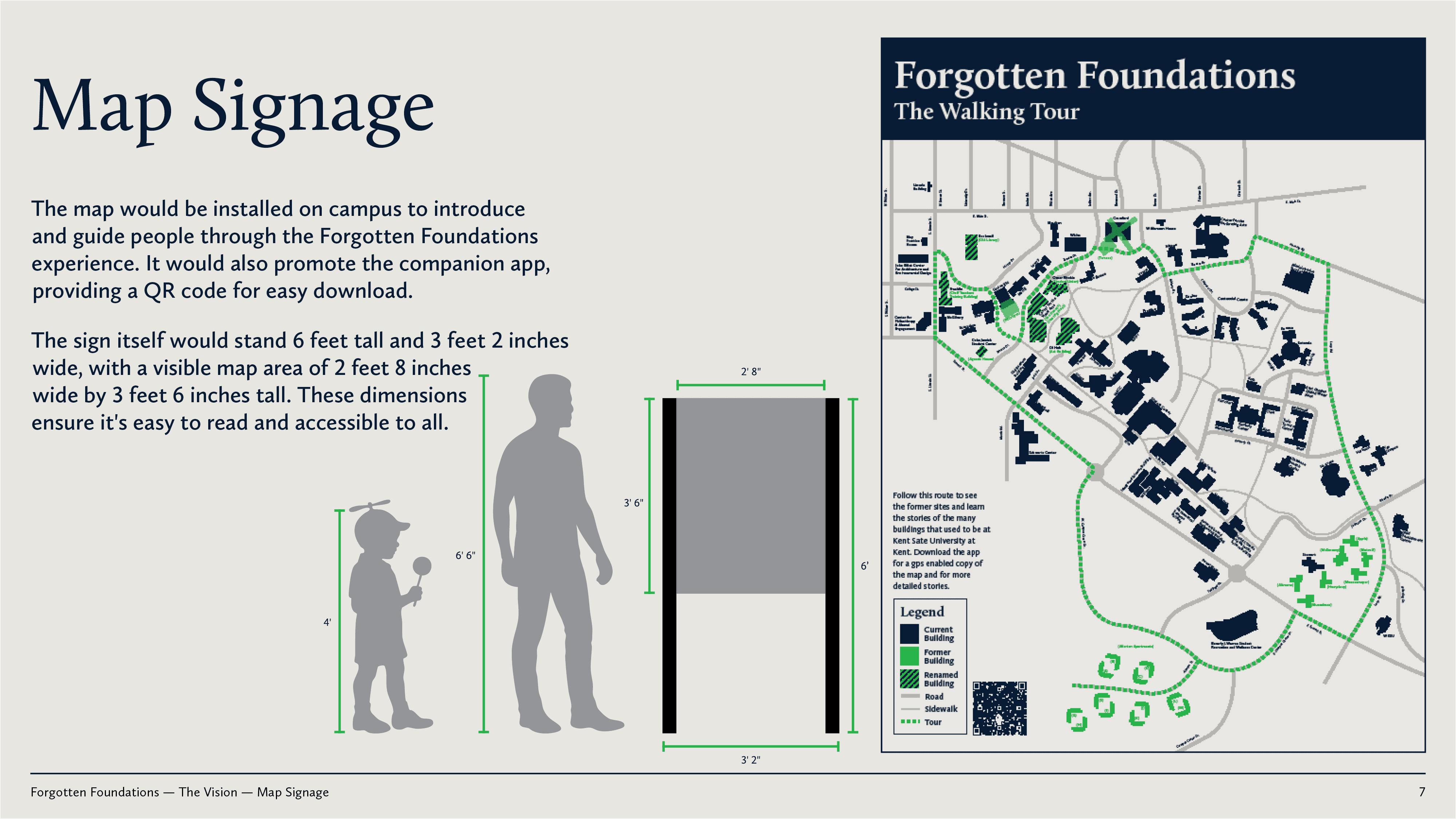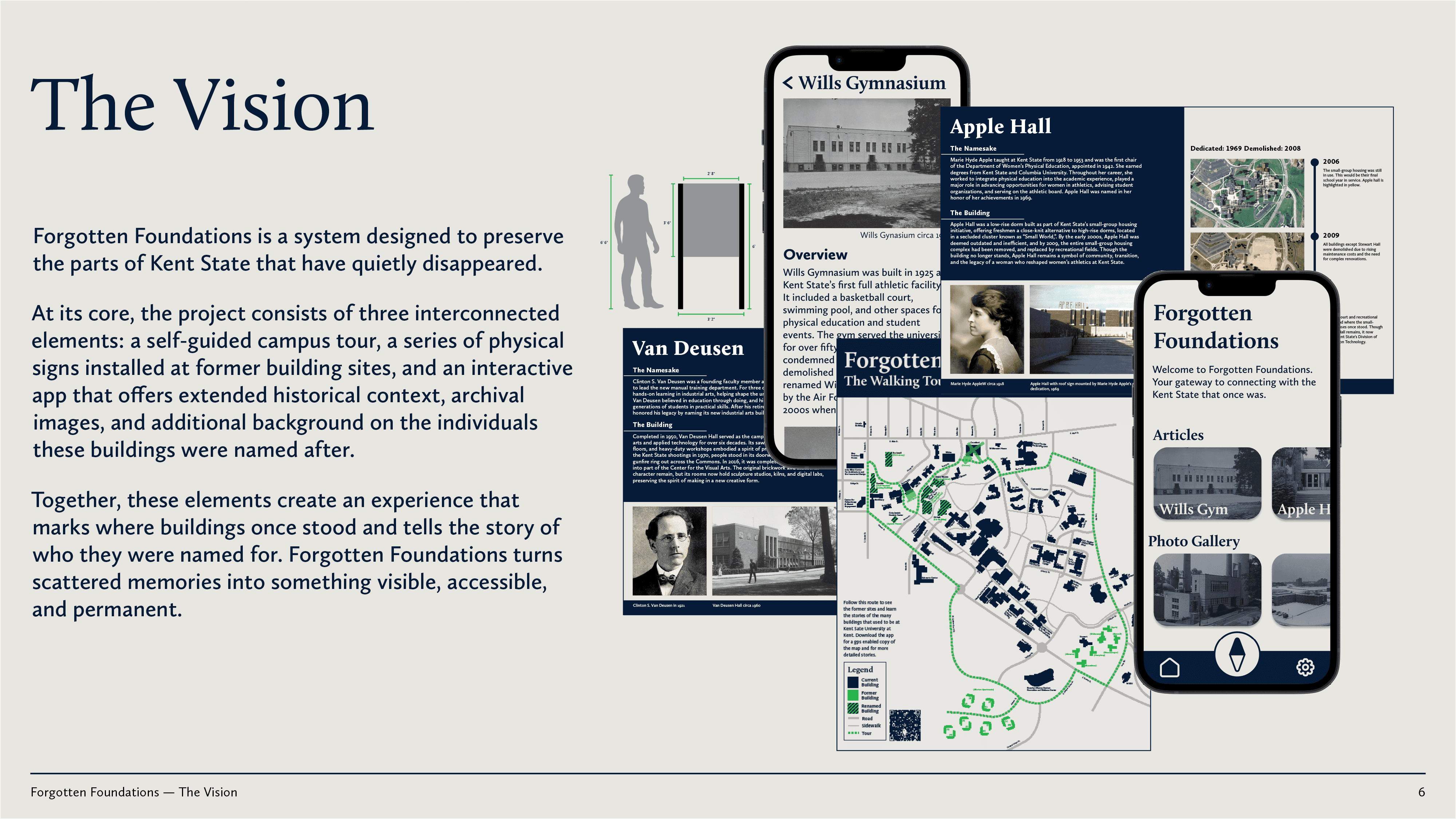 Forgotten Foundations is a campaign preserving the lost history of Kent State through design, highlighting demolished and renamed buildings. Using a system of signage, a self-guided campus tour, and a companion app paired with a pitch deck, the project combines research and visual storytelling to make overlooked histories visible.