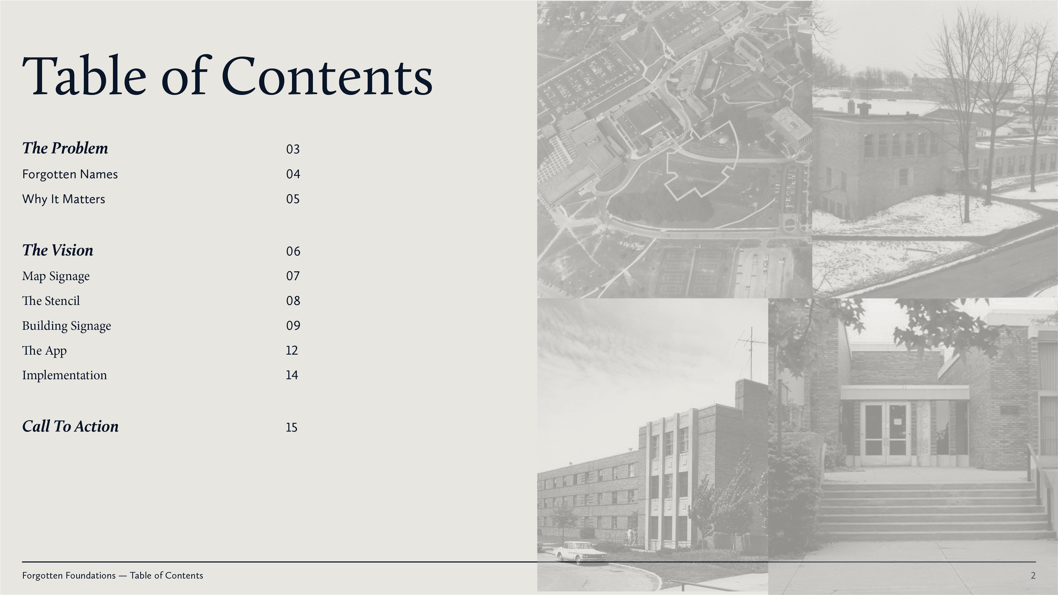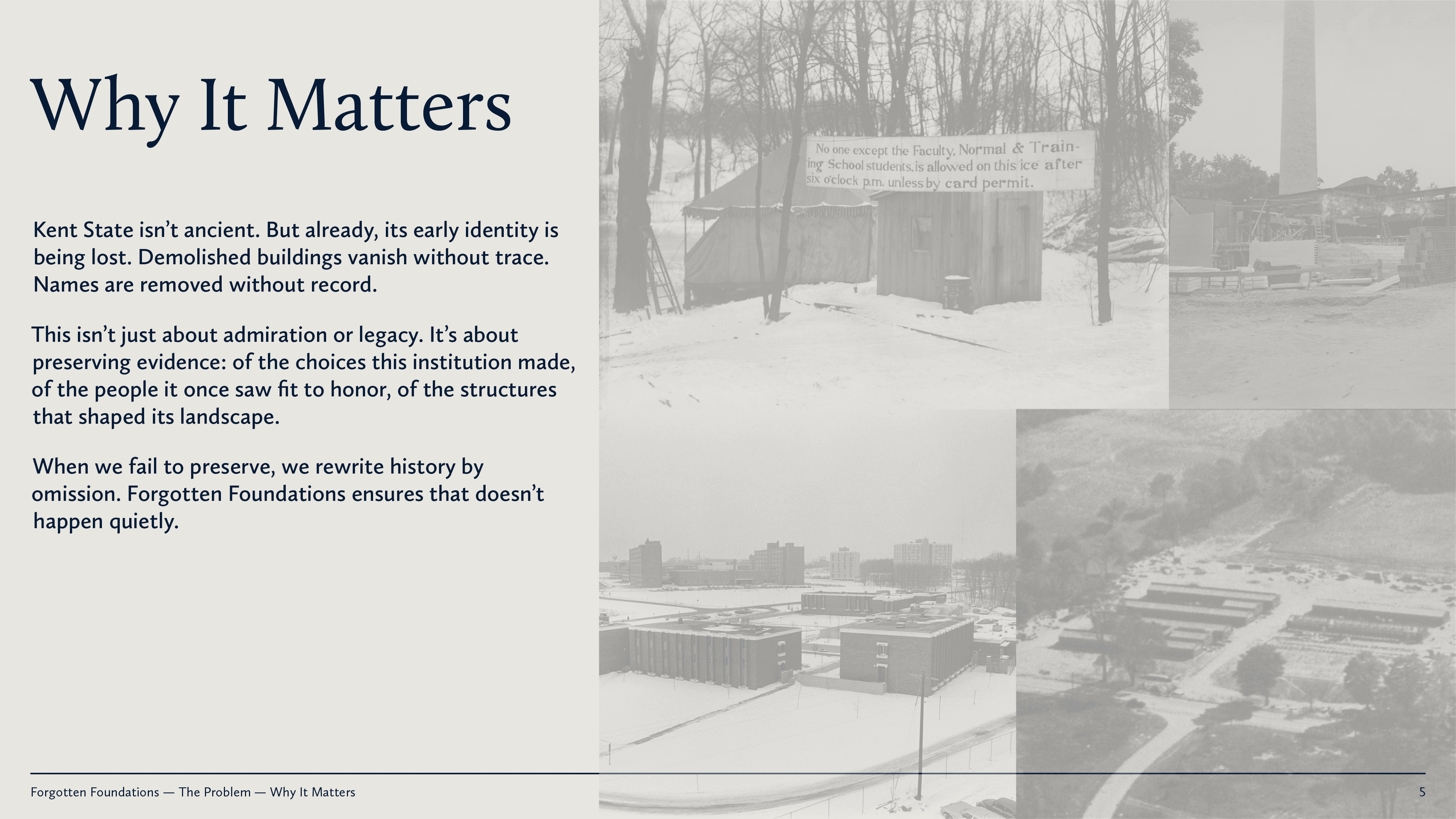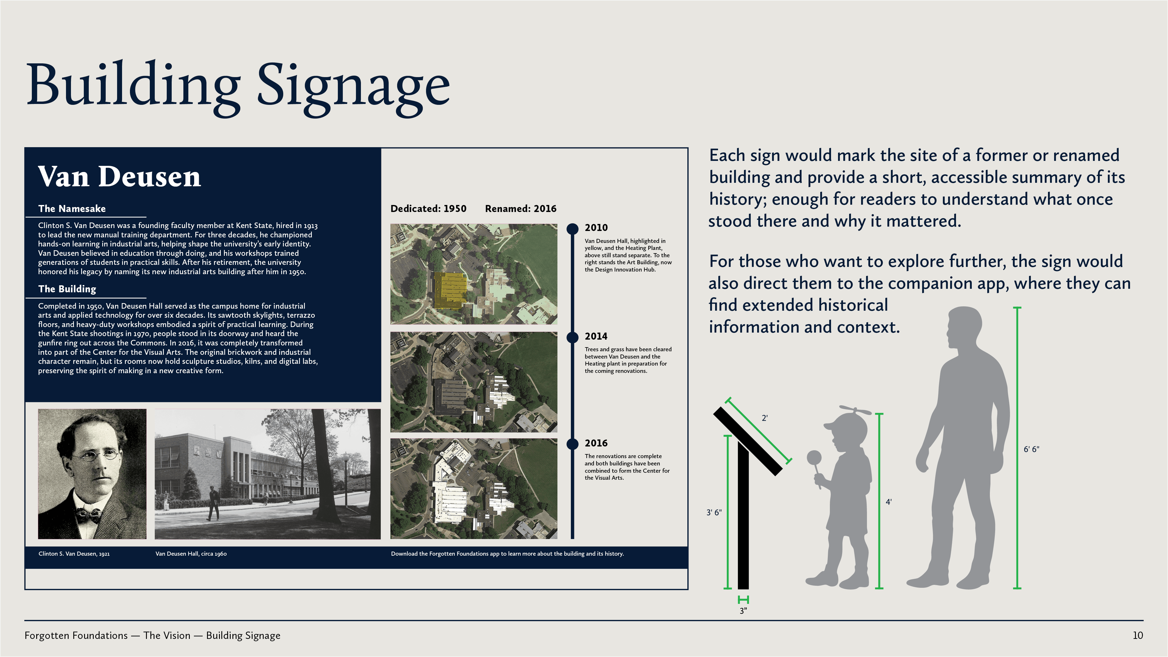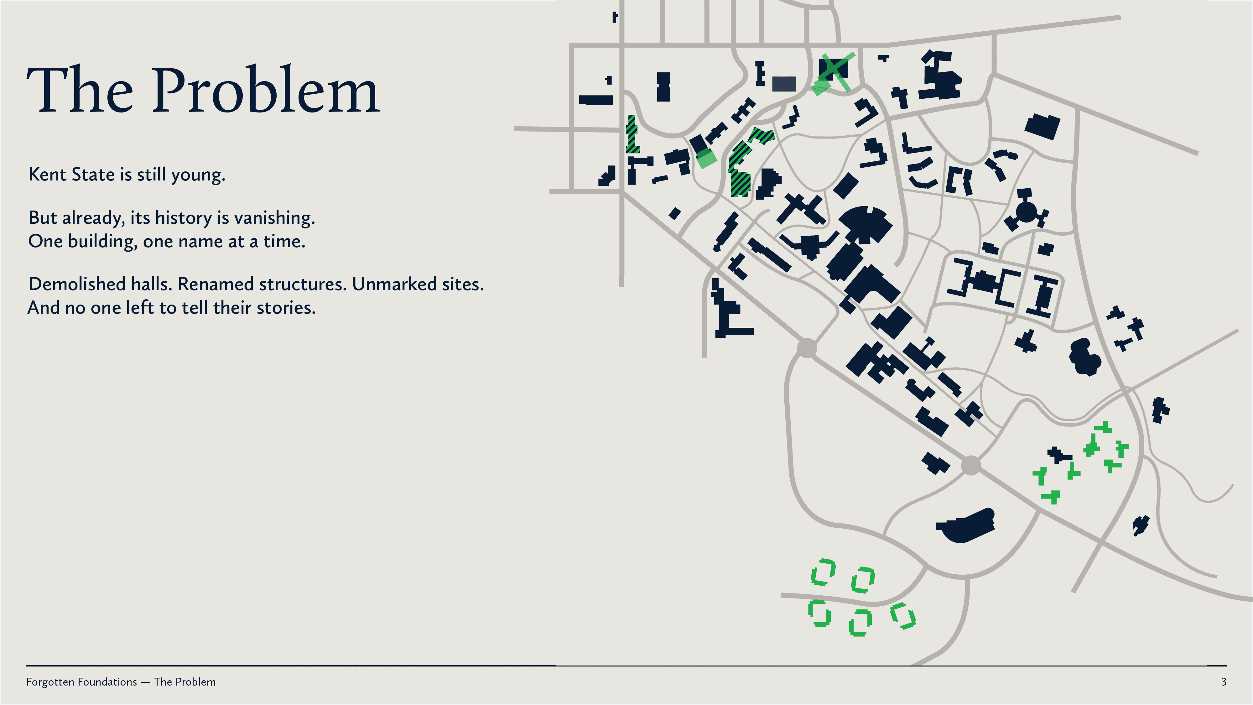 Forgotten Foundations is a campaign preserving the lost history of Kent State through design, highlighting demolished and renamed buildings. Using a system of signage, a self-guided campus tour, and a companion app paired with a pitch deck, the project combines research and visual storytelling to make overlooked histories visible.