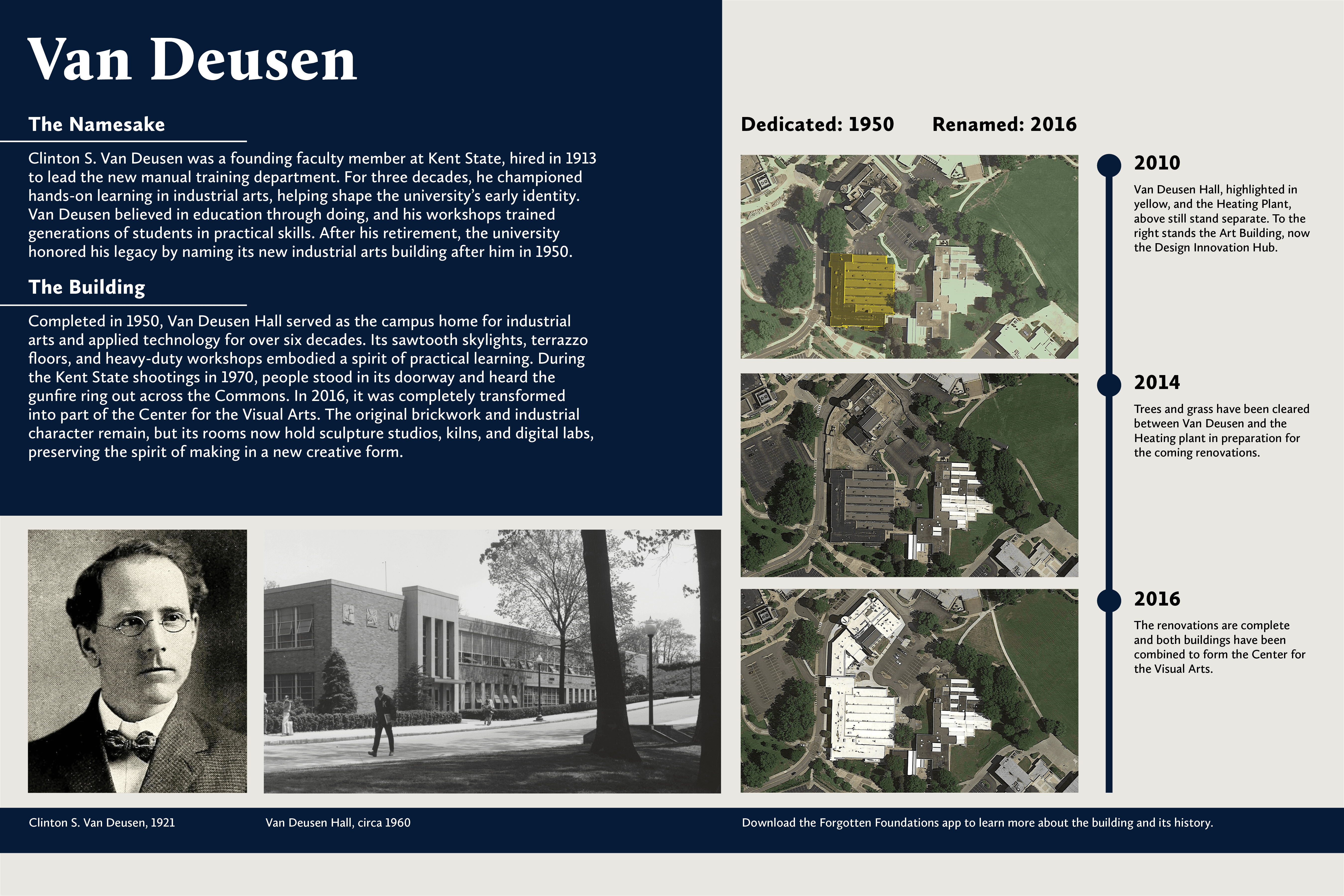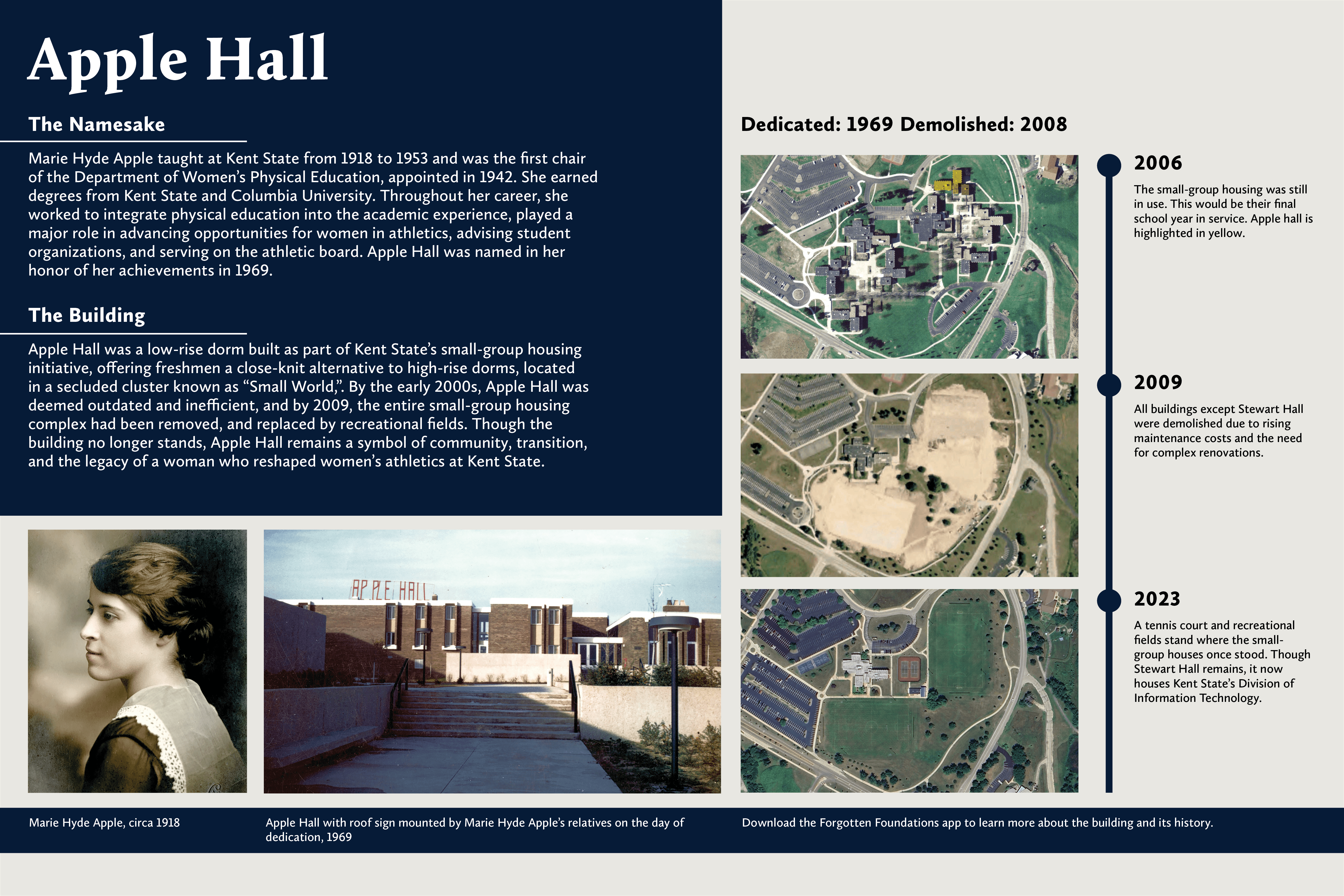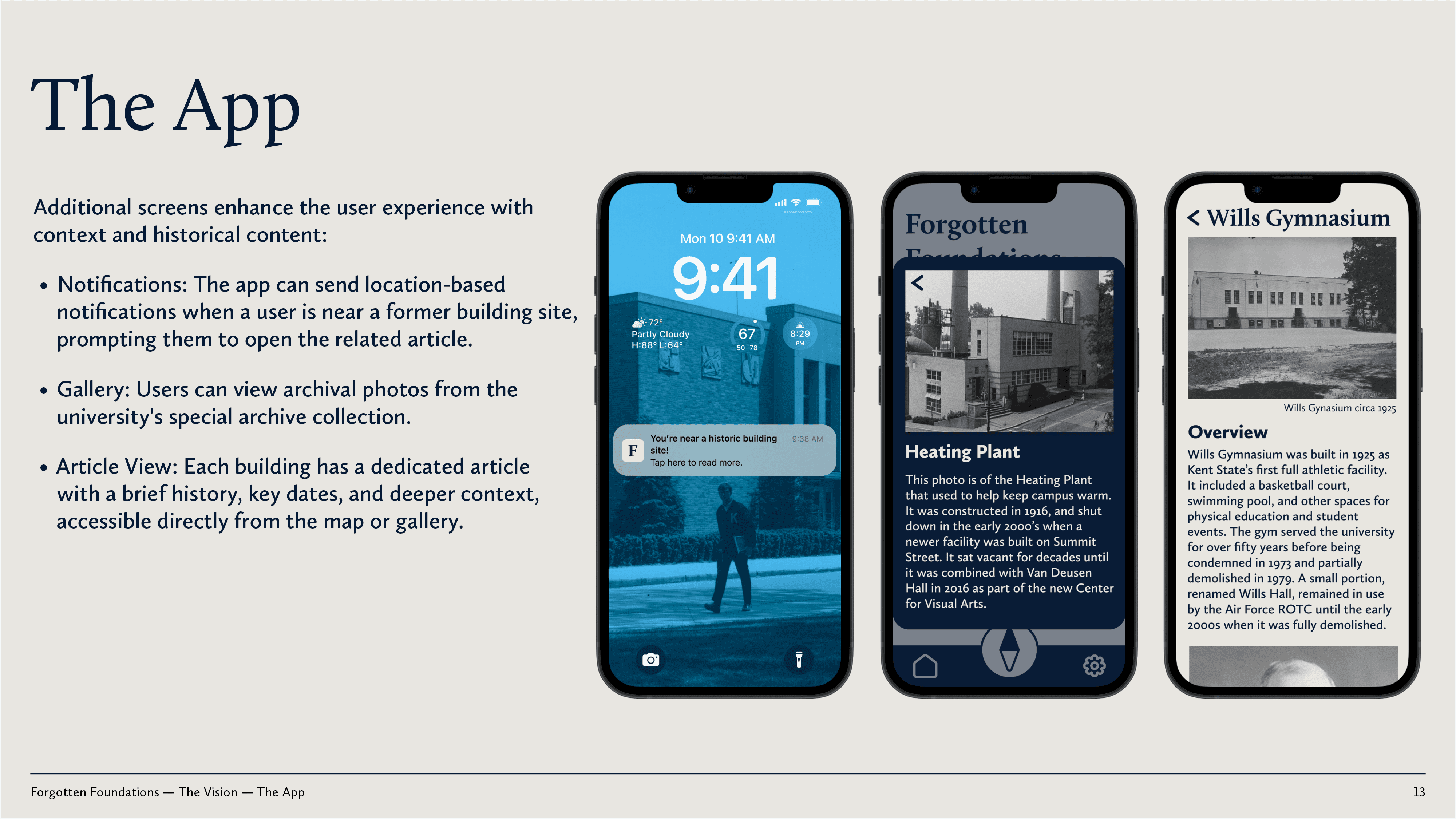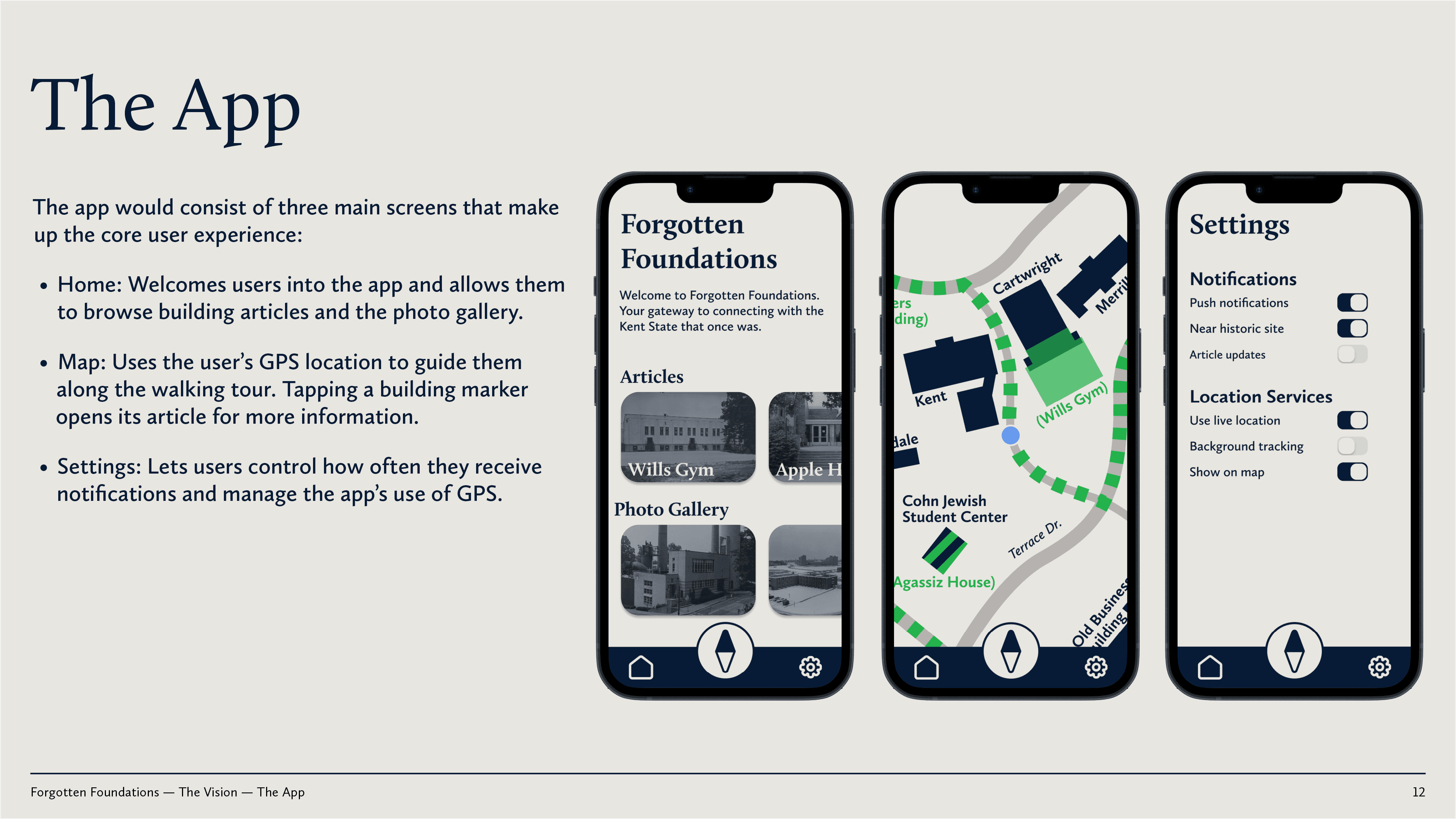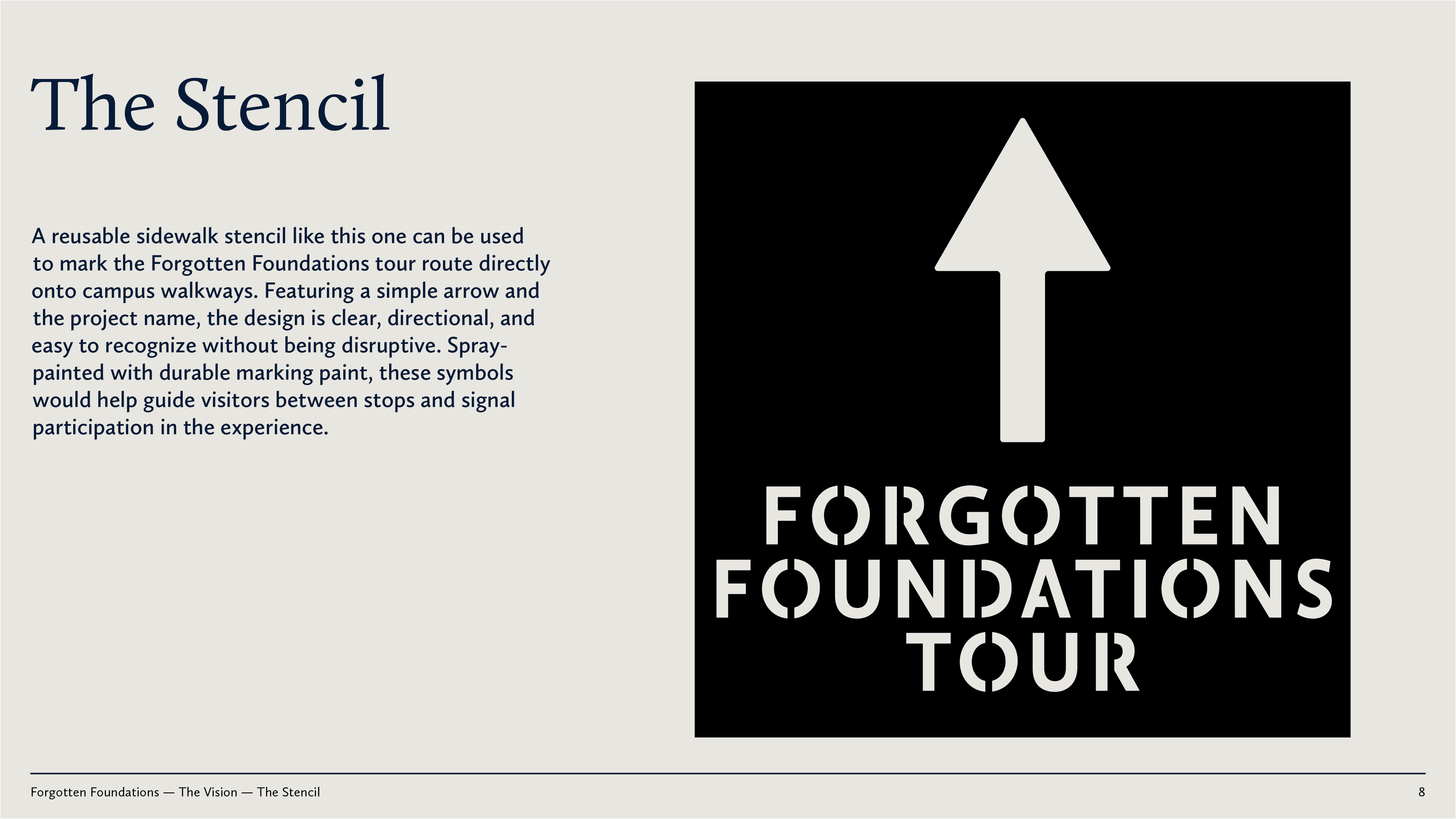 Forgotten Foundations is a campaign preserving the lost history of Kent State through design, highlighting demolished and renamed buildings. Using a system of signage, a self-guided campus tour, and a companion app paired with a pitch deck, the project combines research and visual storytelling to make overlooked histories visible.