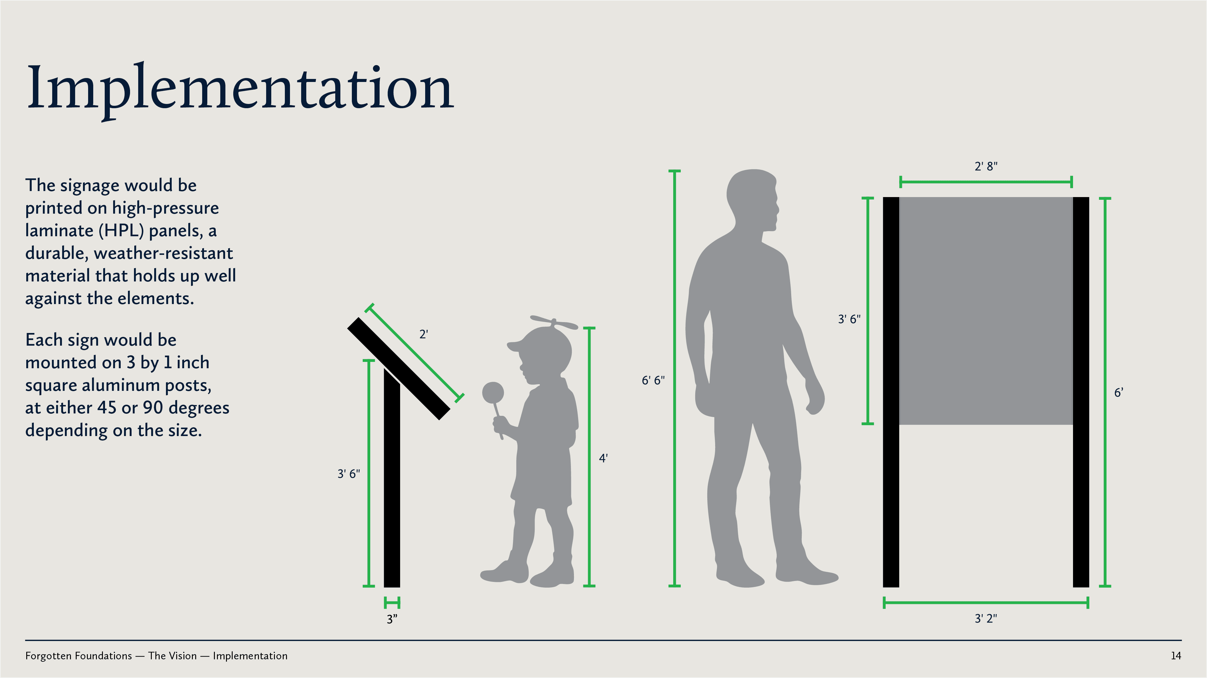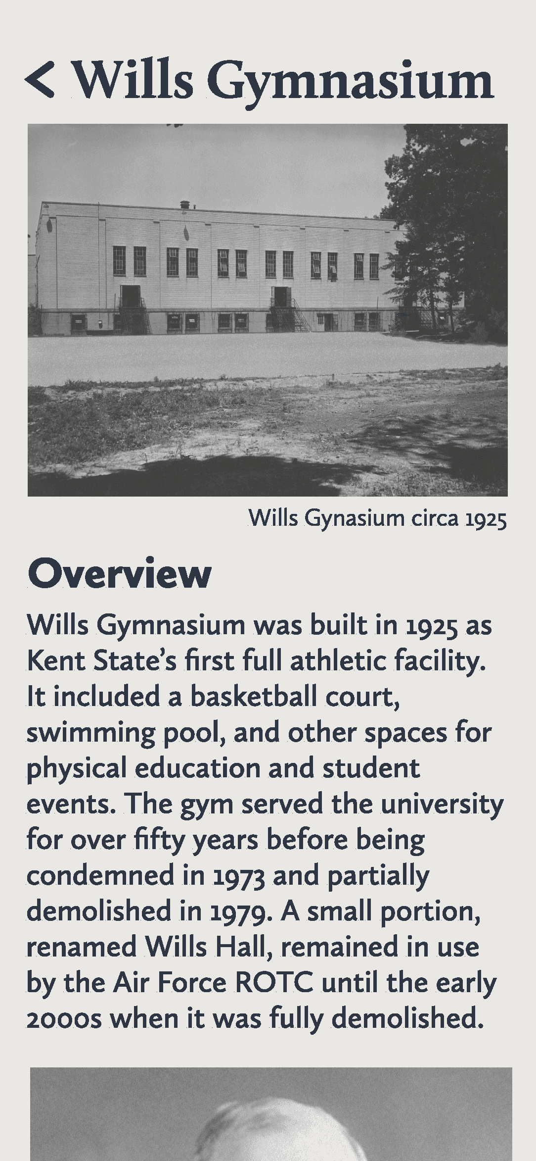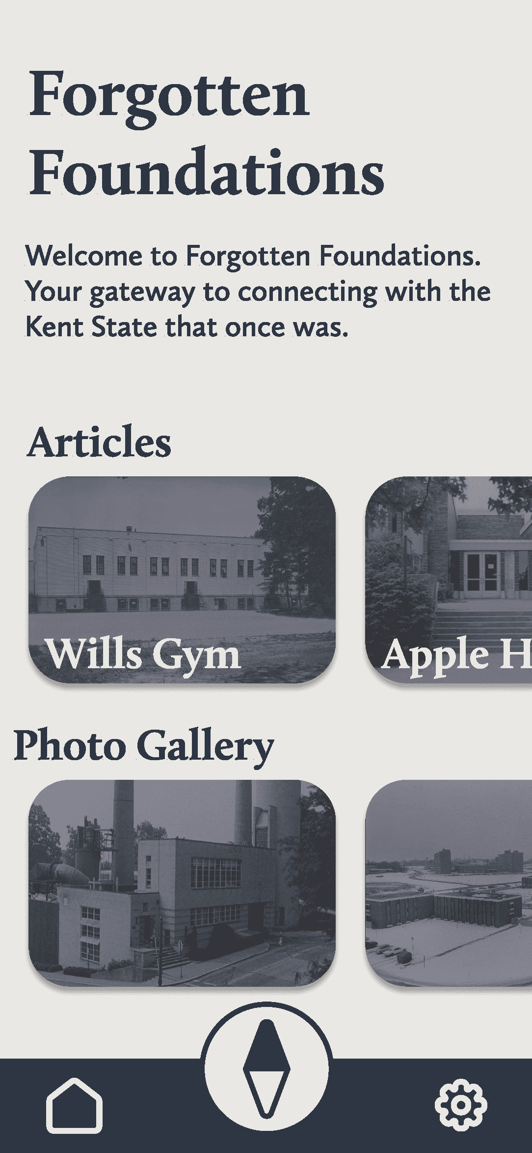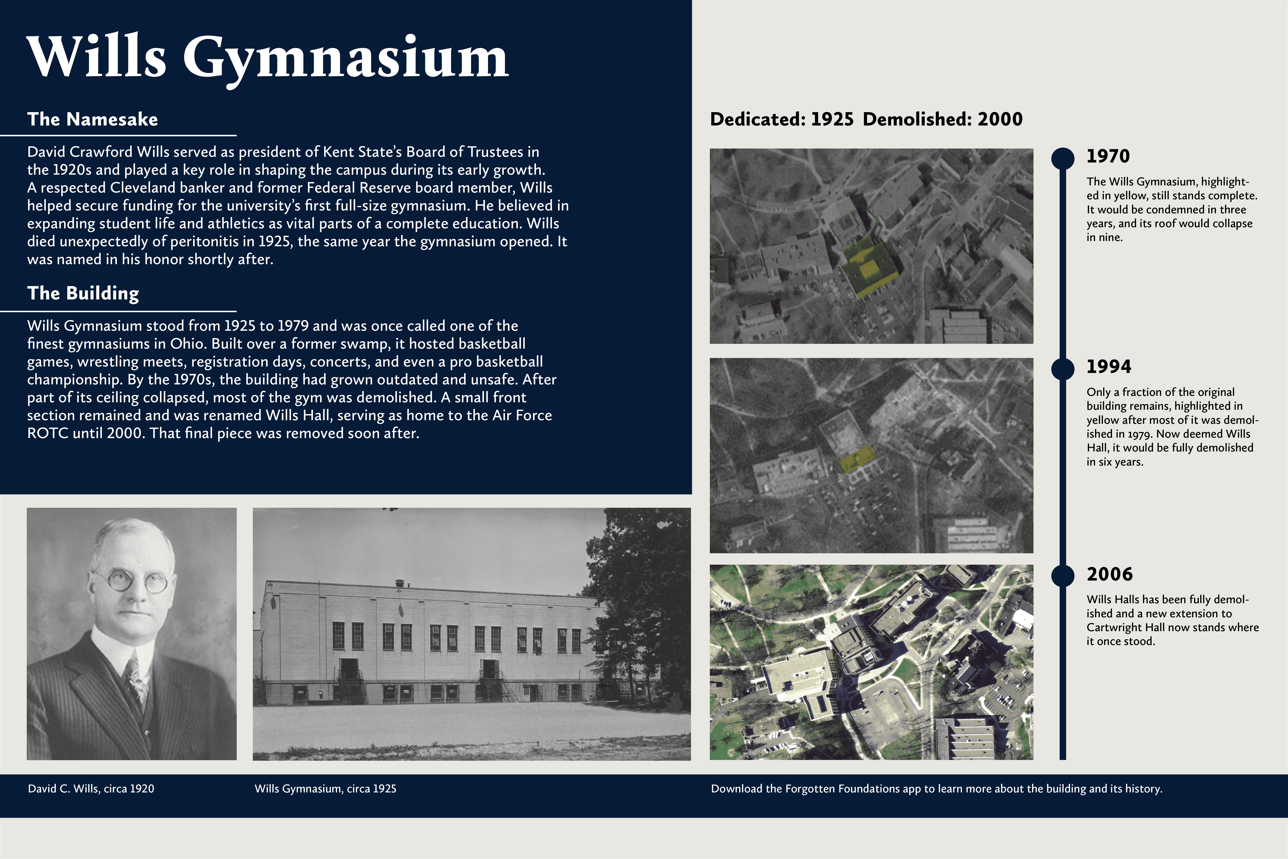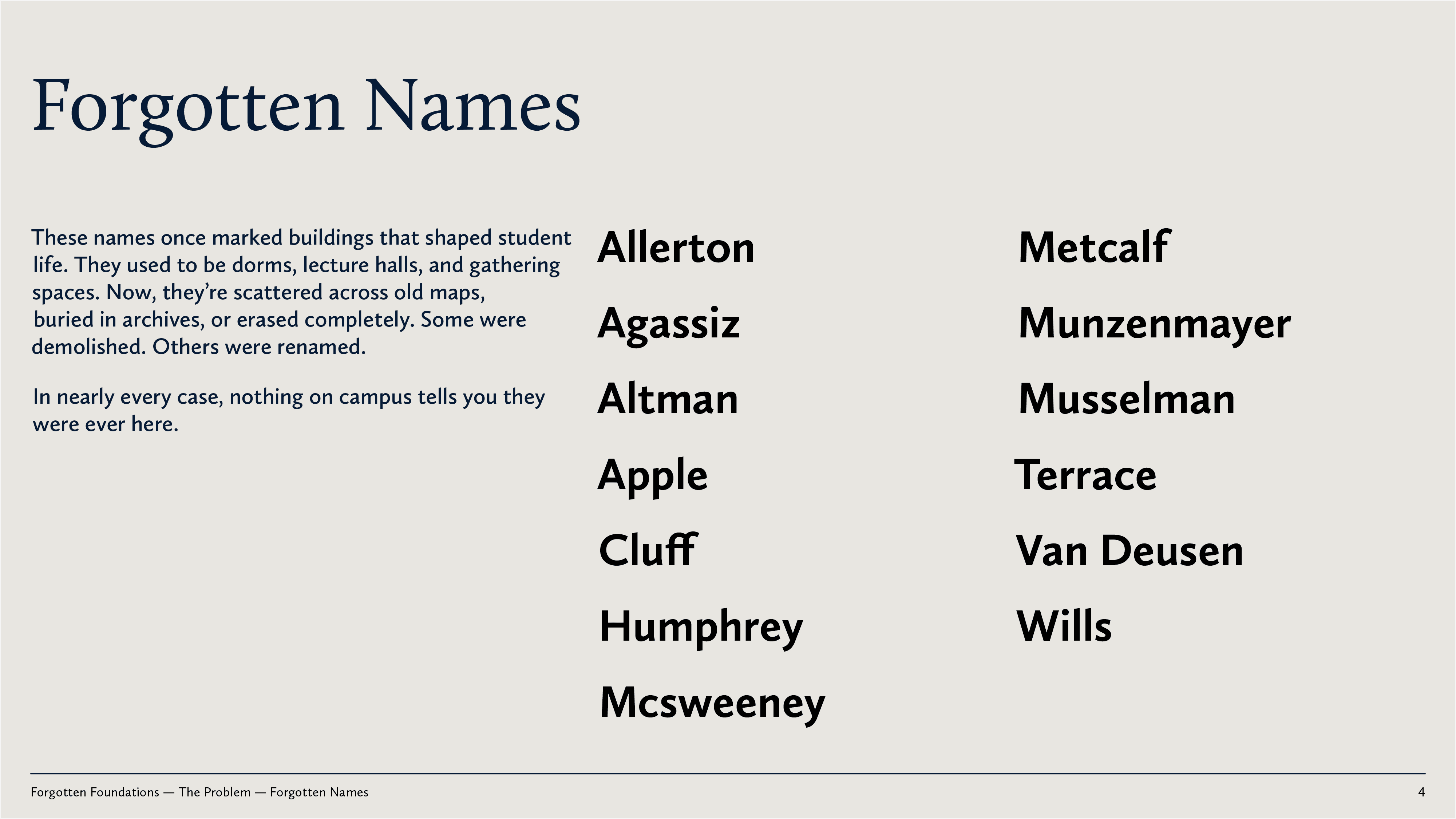 Forgotten Foundations is a campaign preserving the lost history of Kent State through design, highlighting demolished and renamed buildings. Using a system of signage, a self-guided campus tour, and a companion app paired with a pitch deck, the project combines research and visual storytelling to make overlooked histories visible.